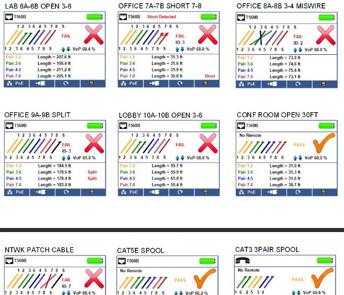 - Tests ethernet cable configuration and verifies connectivity while conducting tests for opens, shorts, miswires, split pairs, and reverses
