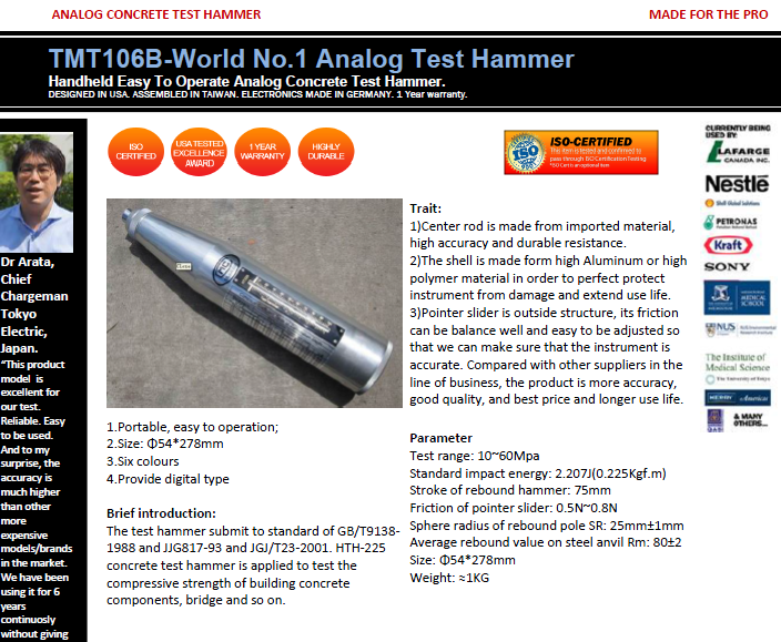 The test hammer submit to standard of GB/T9138-1988 and JJG817-93 and JGJ/T23-2001. concrete test hammer is applied to test the compressive strength of building concrete components, bridge and so on.