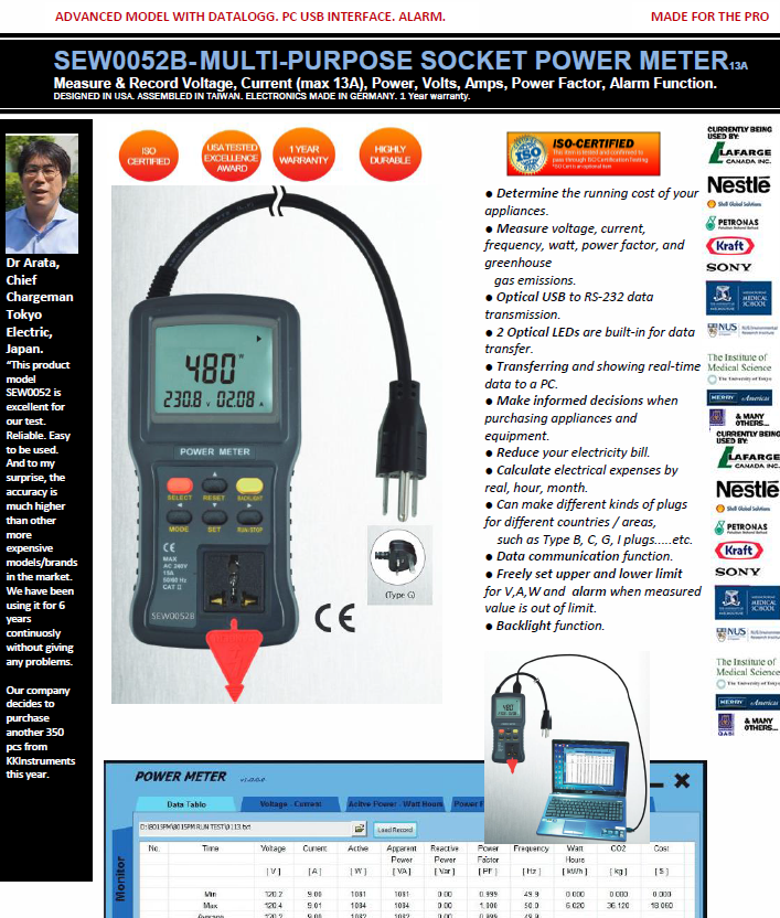 ● Measure voltage, current, frequency, watt, power factor, and greenhouse