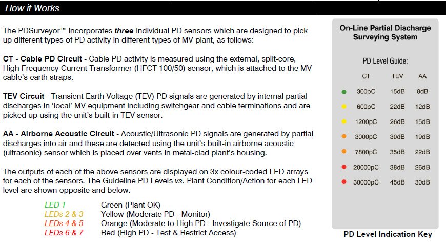 The outputs of each of the above sensors are displayed on 3x colour-coded LED arrays for each of the sensors. The Guideline PD Levels vs. Plant Condition/Action for each LED level are shown below, allowing the user to quickly identify potential insulation defects and incipient faults.